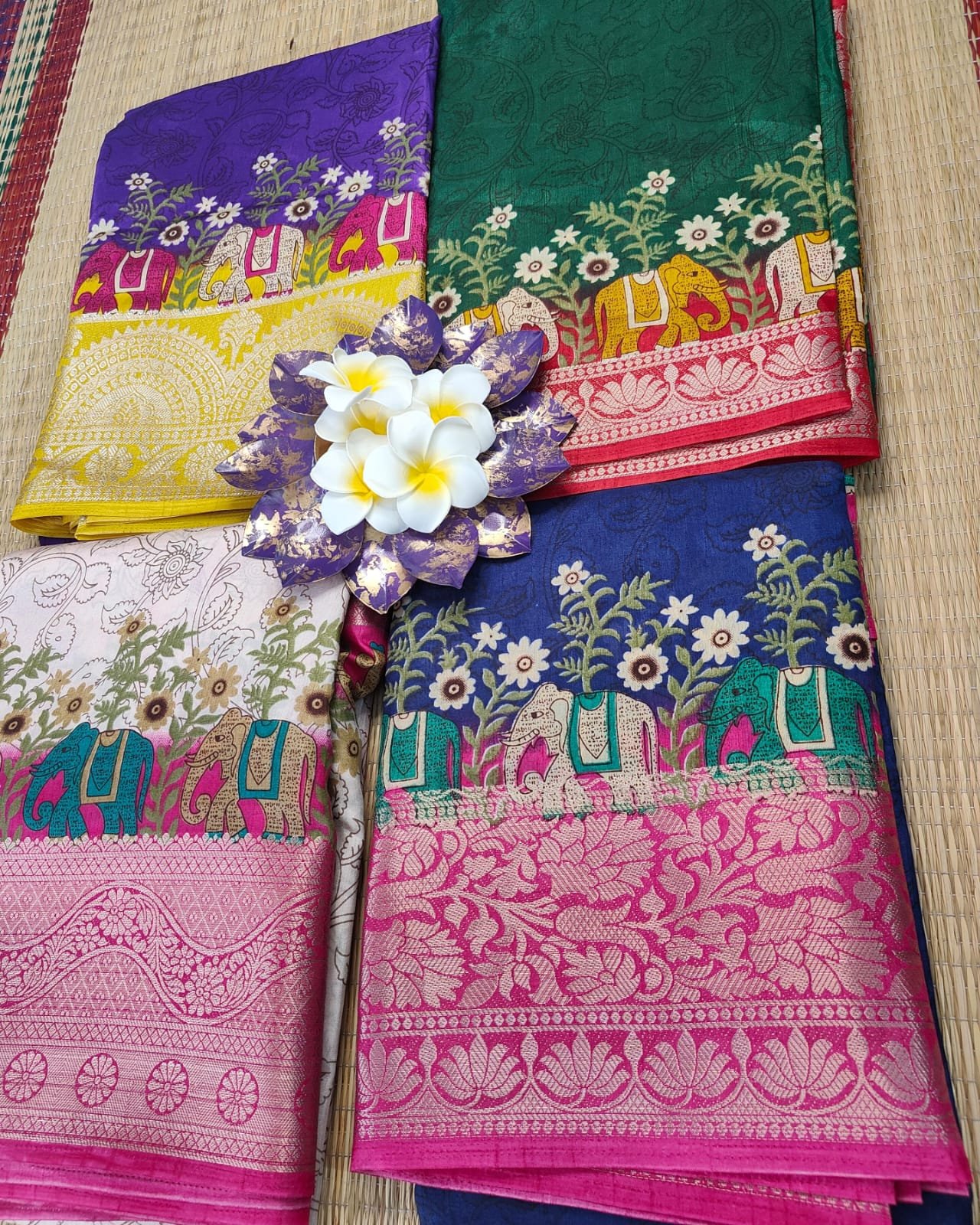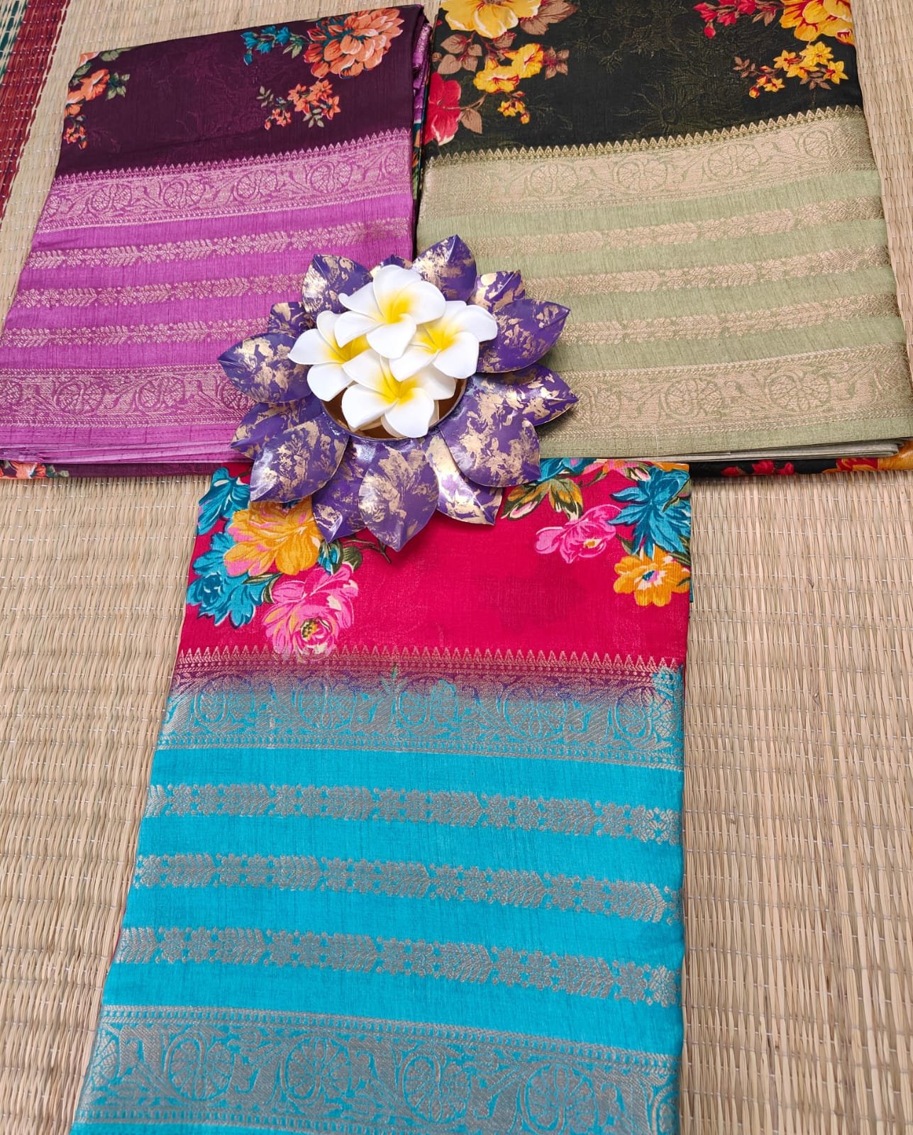 Premium Soft dola Silk Saree with Digital floral Print Allover and sequence madhubani print bigsize border and contrast Border and Classy printed contrast Pallu and contrast printed Blouse🎉🎉🎉🎉🎉🎉🎉🎉🎉🎉🎉